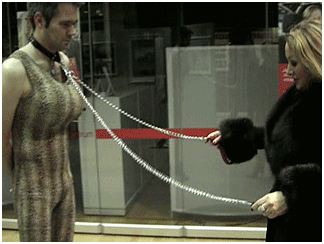 See me walking with the little wildcat through the enlighted bankhall while he has to demonstrate his ss in belly dancing. He is so ridiculous while he dances guided with the leash behind me! We have our fun with him while the bank clerk comes out intending to close the doors. Meanwhile two clients entered the frontroom of the bank and stared curiously towards the dancing slave. Obviously they have never seen something like that before. We pass them by towards our car where the slave has to lock himself into the trunk. Have fun with this very humiliating clip!
